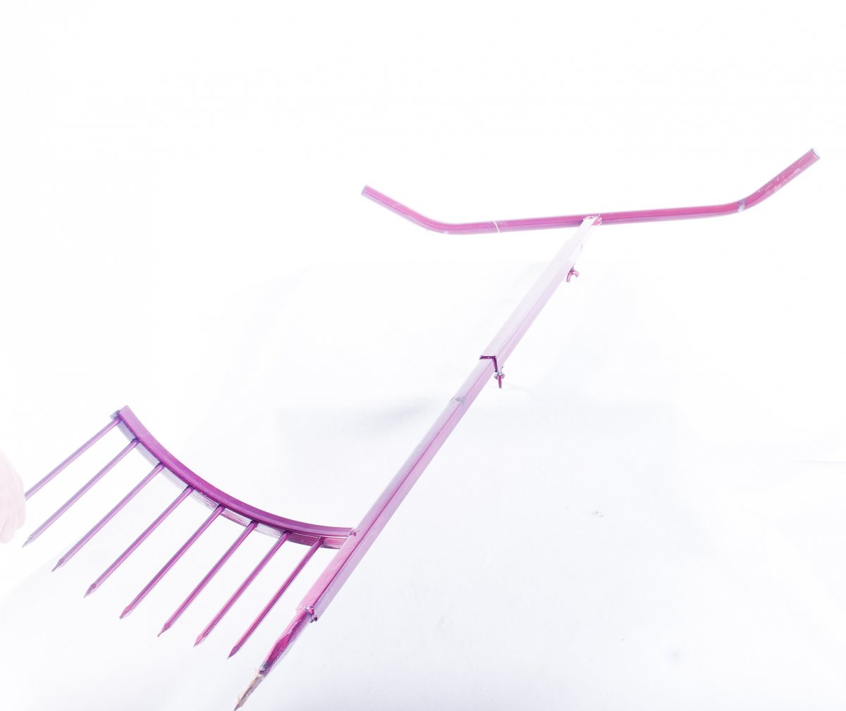Основа – металлический стержень. Наверху стержня подвижная удобная ручка для выполнения нужных поворотов. Внизу металлические штыри с острыми зубцами, которые изогнуты и расположены против часовой стрелки.