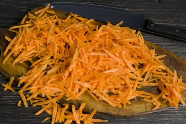 Морковку трём крупно, отправляем в хорошо нагретую сковороду, обжариваем на среднем огне 5-7 минут. Морковь, так же как и лук, лучше пассеровать на сливочном и растительном масле.