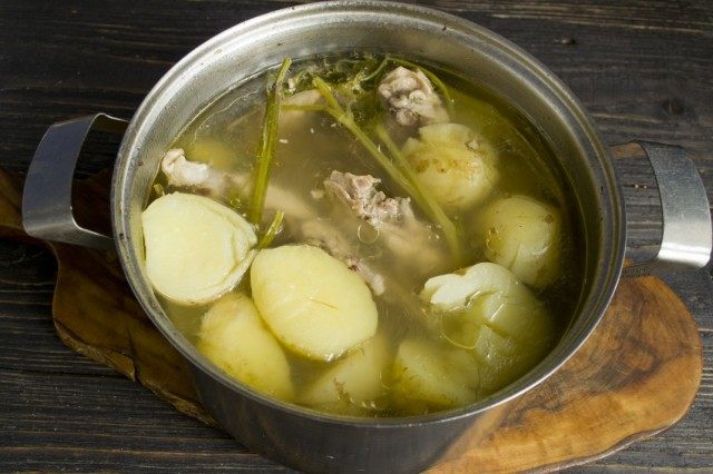 Когда мясо будет легко отделяться от костей, добавляем картофель, варим 15 минут после закипания, солим по вкусу. Картошка в этом блюде должна быть очень мягкой и разваристой.