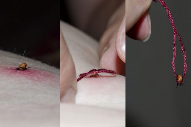 Если вы обнаружили присосавшегося клеща, то удалить его можно самой обычной нитью. Для этого подойдет кусочек длинной около 10 см. Этой нитью обвязывается головка клеща как можно ближе к коже и затягивается на одинарный узел. После этого концы нитки берутся двумя руками и производится вращение (в любую сторону), обычно после нескольких оборотов с легким вытягивающим движением, клещ отпускает хватку.