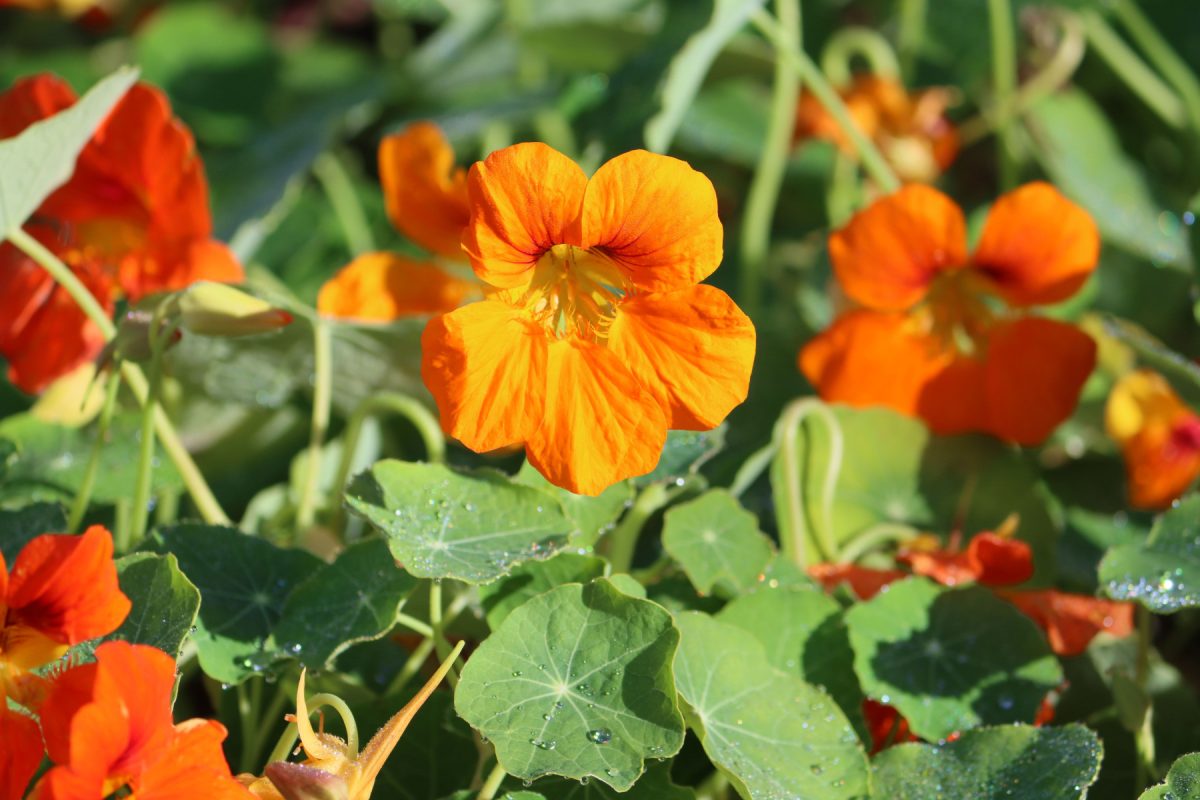 Настурция – это тот случай, когда красота совмещается с пользой. Листья и цветки съедобные, по вкусу напоминают кресс-салат, добавляют остроты в летние салаты. Но у дорожек её сажают не за это. Настурция создаёт плотный зелёный ковёр с яркими жёлтыми, оранжевыми или красными цветками. Она быстро заполняет пустоты, не даёт сорнякам пробиться. Важный нюанс: для дорожек подходят только кустовые формы, а не плетистые. Плетистая настурция уползёт на несколько метров и закроет половину участка. А кустовая держится в пределах 40 сантиметров и ведёт себя прилично. Недостаток – тля её просто обожает, но если рядом растут бархатцы или лаванда, тли будет меньше.