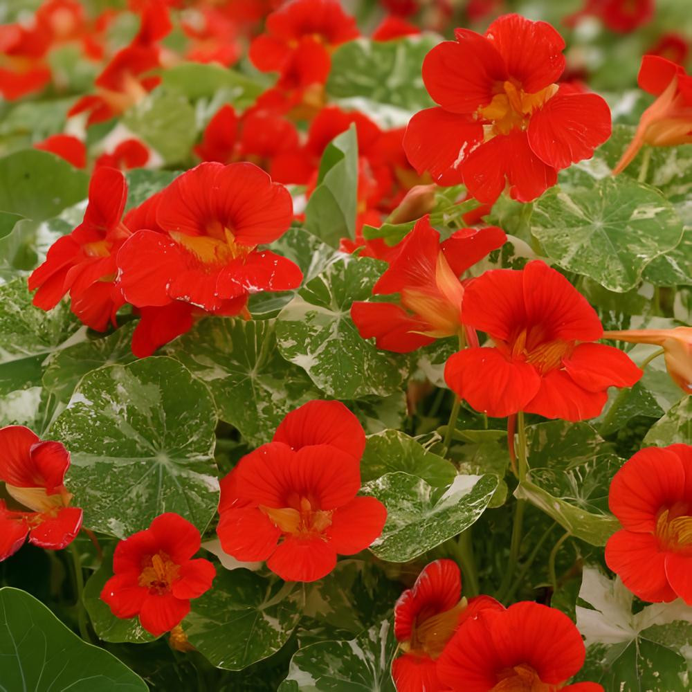 - «Аляска Скарлет» (Tropaeolum majus ‘Alaska Scarlet’) – алые цветки, листья с белыми пятнами