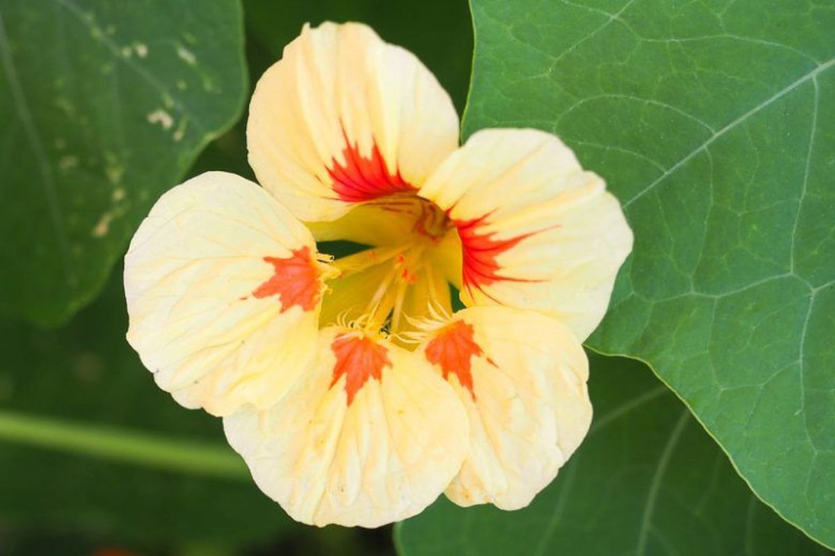 - «Пич Мельба» (Tropaeolum majus ‘Peach Melba’) – кремово-персиковая с красным центром
