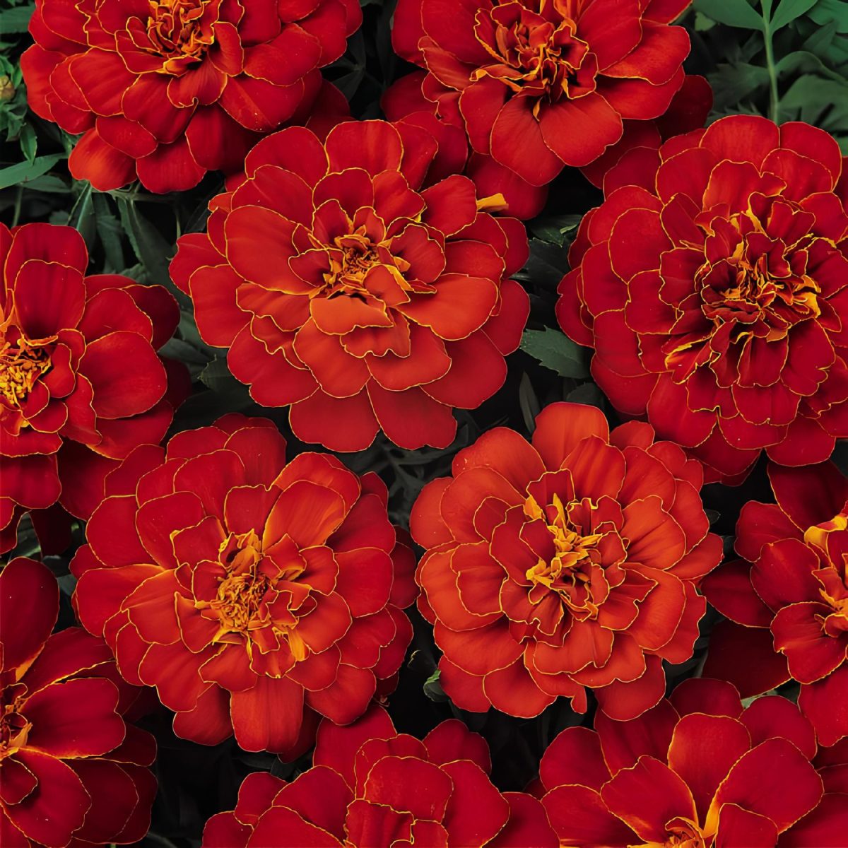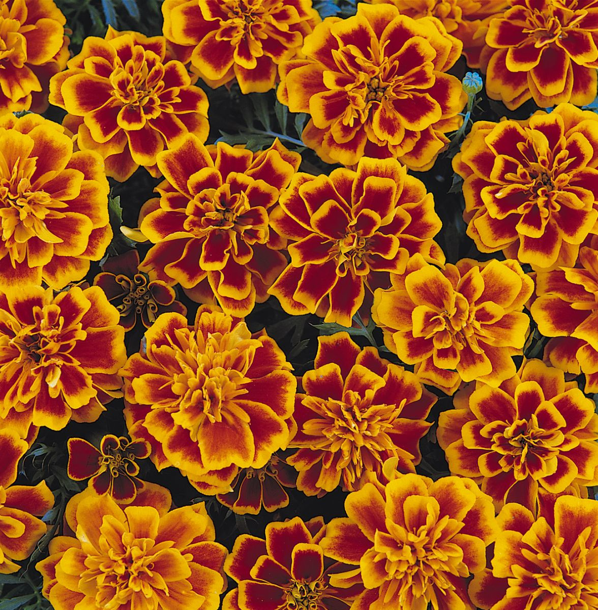 - «Бонанза Флэйм» (Tagetes patula ‘Bonanza Flame’) – махровые красно-оранжевые, 20 см