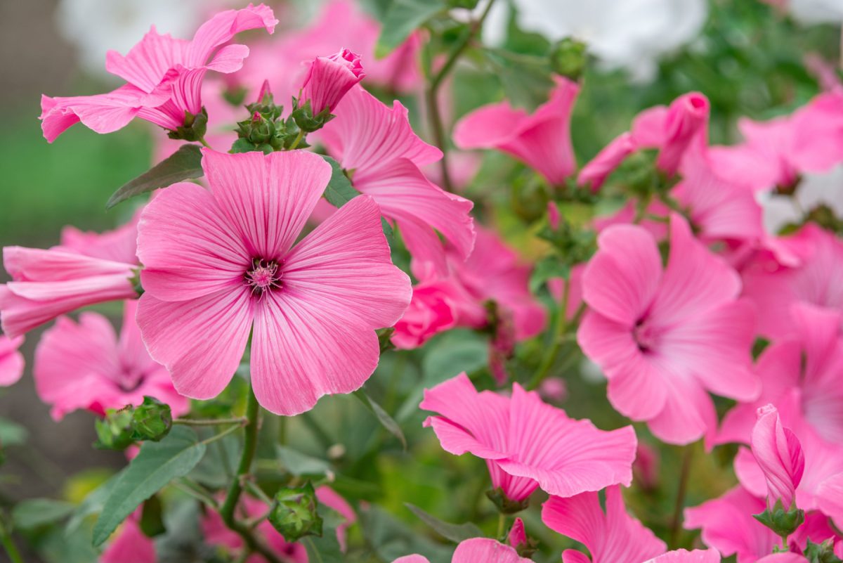 - «Сильвер Кап» (Lavatera trimestris ‘Silver Cup’) – ярко-розовые цветки с тёмными прожилками
