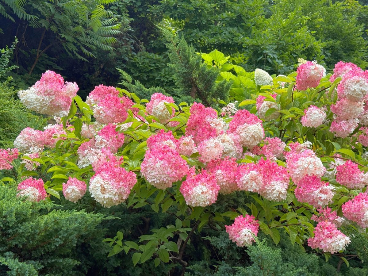 Гортензия метельчатая (Hydrangea paniculata) — королева позднего лета. Сорт «Ванилла Фрейз» (Hydrangea paniculata ‘Vanille Fraise’) с огромными конусами соцветий, которые меняют цвет с белого на розовый, вырастает до 150 сантиметров. «Бобо» (Hydrangea paniculata ‘Bobo’) — компактный вариант высотой около метра, подходит для небольших участков. Гортензию нужно обрезать весной, оставляя 3–4 почки на побегах, тогда соцветия будут крупными. Она любит влагу, поэтому в жару требует полива.