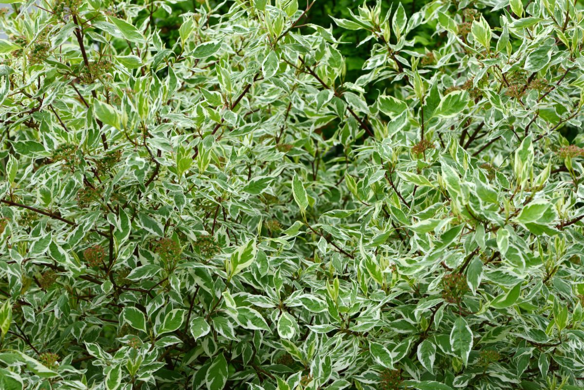 Дерен белый (Cornus alba) — кустарник, который декоративен круглый год. Летом это зеленая или пестрая листва, осенью — красно-оранжевые тона, зимой — ярко-красные или желтые побеги, которые выглядят эффектно на фоне снега. Сорт «Элегантиссима» (Cornus alba ‘Elegantissima’) с бело-зелеными листьями вырастает до 2 метров. Дерен неприхотлив, но раз в несколько лет его нужно сажать на пень, чтобы молодые побеги оставались яркими.