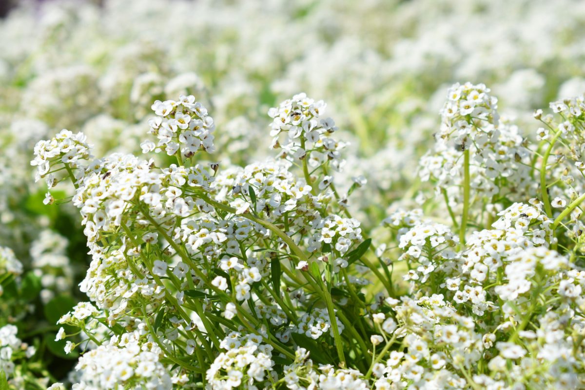 Лобулярия морская, она же алиссум (Lobularia maritima), создает воздушные подушки белого, розового или фиолетового цвета. Высота около 15 сантиметров, аромат медовый, пчелы слетаются со всей округи. Алиссум самосевом рассыпается вдоль забора и на следующий год появляется в самых неожиданных местах, что только добавляет естественности композиции. Любит солнце, в тени вытягивается и цветет скупо.