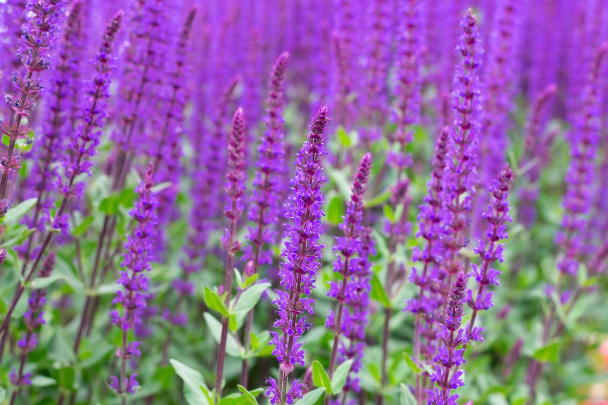Шалфей дубравный (Salvia nemorosa) — еще один фаворит для солнечных мест. Сорта вроде «Карадонна» (Salvia nemorosa ‘Caradonna’) с темно-фиолетовыми свечками соцветий на почти черных стеблях смотрятся очень графично. Высота около 60 сантиметров, цветение с июня по август. Шалфей хорош тем, что после первой волны цветения его можно коротко обрезать, и к концу лета он выдаст вторую волну. Единственное требование: не сажать в низинах, где застаивается вода, иначе корни загниют.