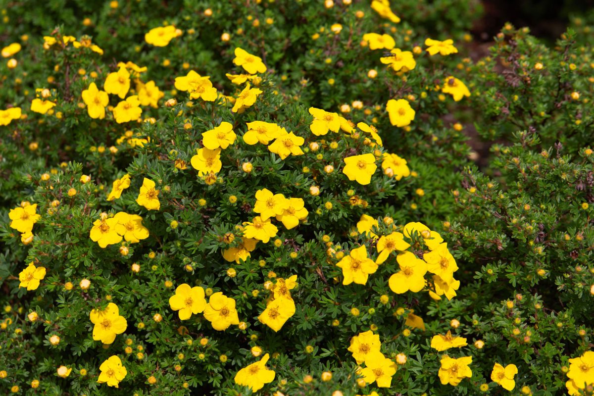Лапчатка кустарниковая (Dasiphora fruticosa) — неубиваемый кустарник для любых условий. Высота от 50 до 100 сантиметров, цветение с июня до заморозков. Цветки желтые, белые, розовые, оранжевые, в зависимости от сорта. Лапчатка переносит и жару, и холод, и стрижку, и засуху. Единственное, что ей не нравится, — застой воды. Если посадить ее вдоль забора группами по три-пять кустов, получится нарядная живая изгородь.
