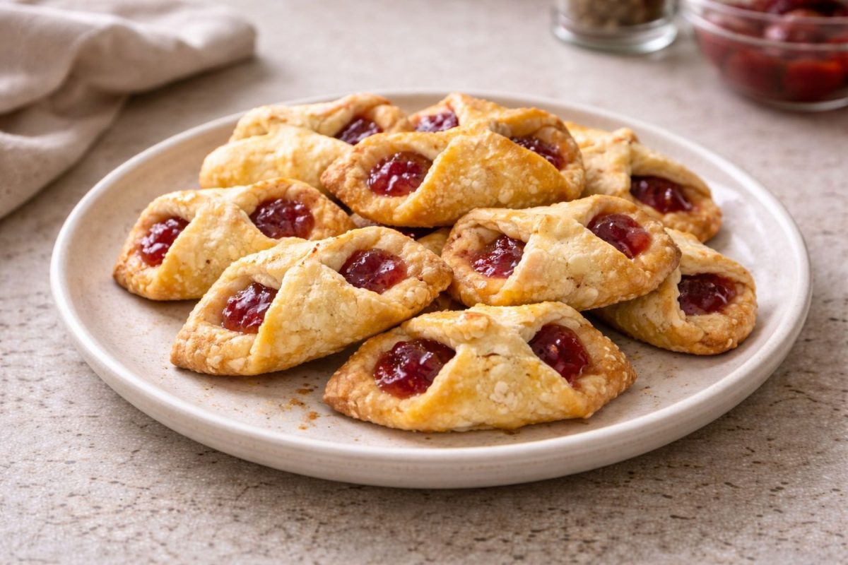 Это печенье делается из творожного теста, которое очень просто замешивается и раскатывается. Внутри можно положить любую начинку: джем, варёную сгущёнку, шоколад. Получается нежное, рассыпчатое, тает во рту.
