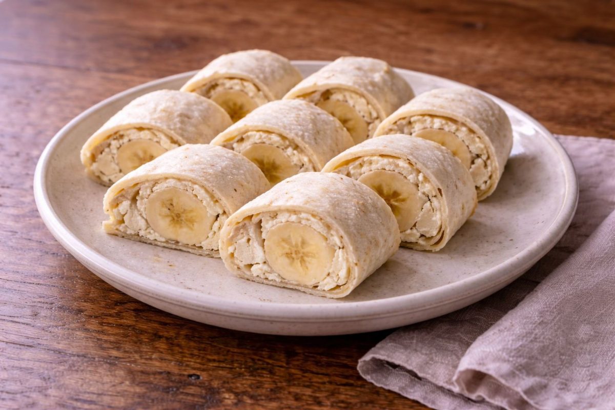 Как готовить: Творог смешайте со сметаной и сахаром до однородности. Лаваш расстелите, смажьте творожной массой. Бананы нарежьте тонкими кружочками, выложите по всей поверхности. Посыпьте рублеными орехами (если используете). Сверните лаваш в плотный рулет, заверните в плёнку, уберите в холодильник на полчасика. Нарежьте порционными кусочками перед подачей.
