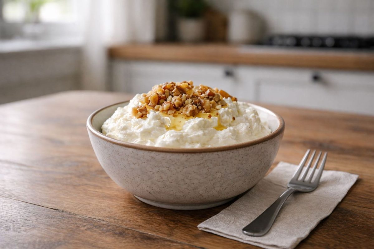 Звучит просто, но если сделать правильно, получается завтрак, который хочется повторять. Творог взбивается до воздушности (я использую блендер, но можно и вилкой хорошенько размять), мёд даёт сладость без приторности, а орехи добавляют хруст. Грецкие, миндаль, кешью — любые, какие есть. Иногда добавляю корицу, иногда ванильный экстракт. Ем ложкой из пиалы или намазываю на хлеб.