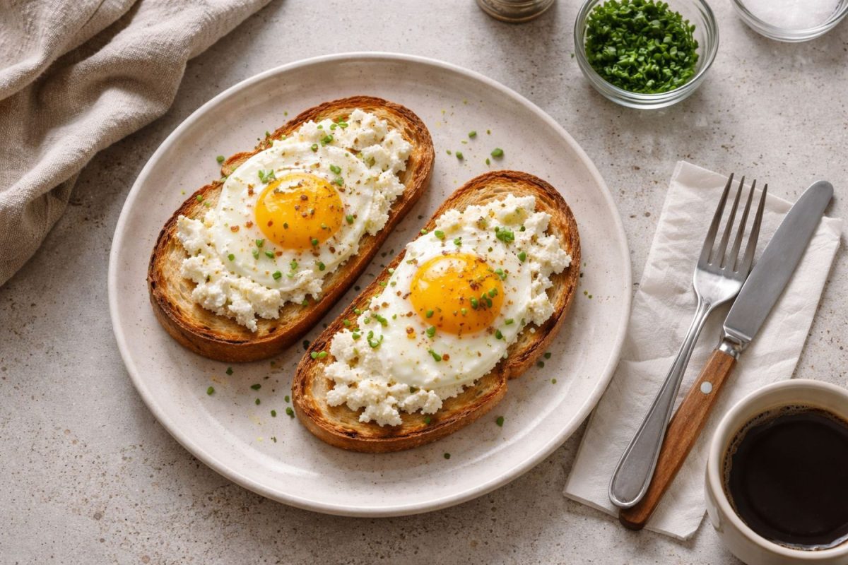 Как готовить: Хлеб слегка подсушите на сковороде. Намажьте творогом (можно предварительно размять его с солью и зеленью). Сделайте в твороге небольшое углубление, разбейте туда яйцо. Посолите, поперчите. Готовьте под крышкой на среднем огне 5-7 минут, пока белок не схватится. Или отправьте в духовку при 180° на 7-10 минут.