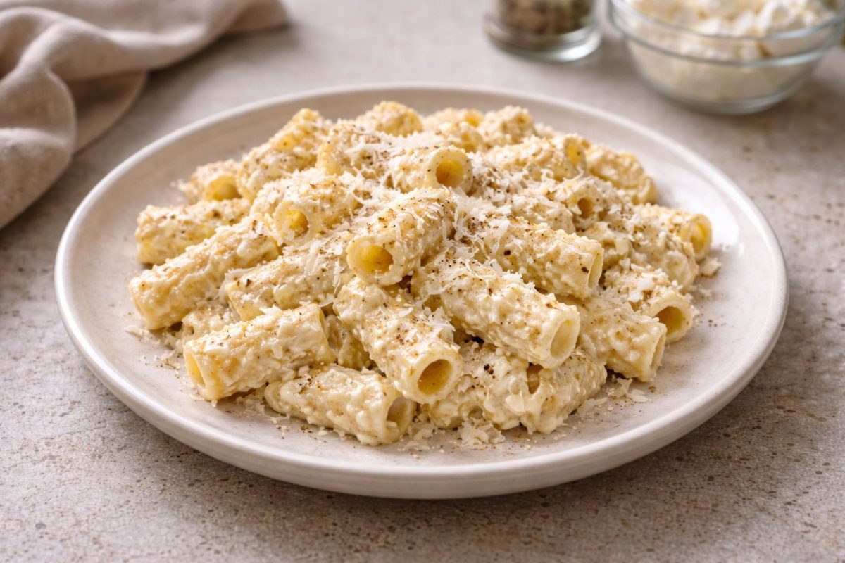 Звучит непривычно, но это работает. Творог при нагревании с небольшим количеством воды от пасты превращается в кремовый соус, чеснок даёт аромат, сыр добавляет глубину вкуса. Готовится за то время, пока варится паста.