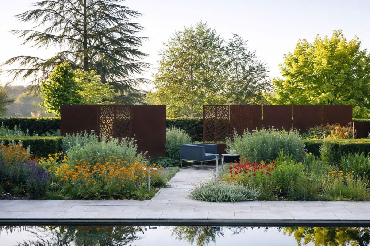 Сочетание архитектурной простоты с пышной растительностью придает саду неповторимую изысканность. Простая геометрия дома и других построек, садовых МАФов и дорожек, их сдержанная цветовая палитра только подчеркивают красоту живой природы. Причем эффект тем больше, чем больше контраст. Сложные многоярусные живые изгороди, фоновое озеленение, словно сливающееся с окружающим лесом, высокие злаки и цветущие многолетники, продолжающие луговой ландшафт, – экспериментируйте.