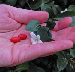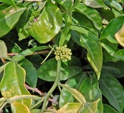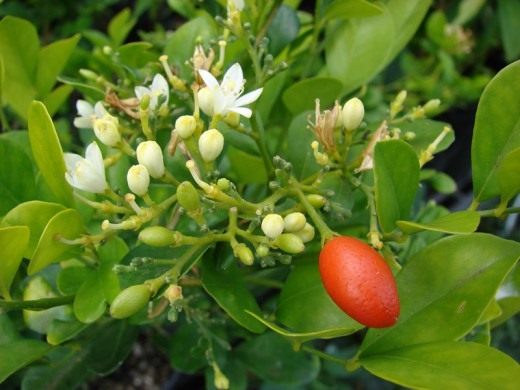 Вот. Много ещё на самом деле разных интересных цитрусовых, но хватит уже о них. Поговорим немного об их собратьях по семейству. Рутовых вообще адски много и они невероятно разнообразны. Но есть роды, видимо, более и менее близкие друг другу. Вот, например, муррайи – отдельный род семейства рутовых, не цитрусы. Но их плоды похожи на плоды цитрусовых, а потому все, кто занимается разведением, изучением и гибридизацией цитрусовых, муррайями тоже интересуется. Муррайи называют ещё апельсиновым жасмином. Выглядят муррайи вот так: