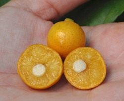 Второй гибрид сунки – каламондин (он же золотой лайм, панамский апельсин), результат скрещивания кислого мандарина и кумквата (о кумквате тоже позже). Гибрид этот – китайского происхождения, но в Европу попал через Филиппины. Он больше унаследовал от кислого мандарина, чем от кумквата, но зато у него съедобная, как у кумквата, корка. Каламондин отлично скрещивается и стал по этому поводу родителем множества гибридов. В пищу его употребляют разнообразно – сам по себе сырым, сушат, вялят, добавляют в маринад к рыбе, солят, как огурцы, маринуют со специями и подают к мясу, делают варенье, мармелад, цукаты. Выглядит он так: