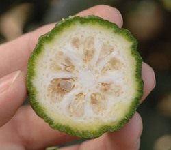 Хоть мякоть и есть, но как-то её тоже маловато, а цедра толстая. Даже странно, как из такого монстра мог мутировать тонкокожий лайм. Внешне на некоторые сорта цитрона похож разве что кафрский лайм (кафирский лайм, кафирлайм, Citrus hystrix, Kaffir lime, дикобразовый цитрус):