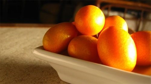 Ну, и сам бог велел после этого перейти к кумкватам. Это такие мелкие, с крайнюю фалангу большого пальца руки взрослого мужчины, желтые или оранжевые плоды, похожие по форме на уменьшенные лимоны. Продаются, как правило, в больших гастрономах, в ламинированных пенопластовых лотках. Появились в Росии относительно недавно, всего несколько лет как. Сперва были адски дорогими, но на сегодняшний день подешевели. Вот, если вы их ещё и не пробовали, то уж видели наверняка: