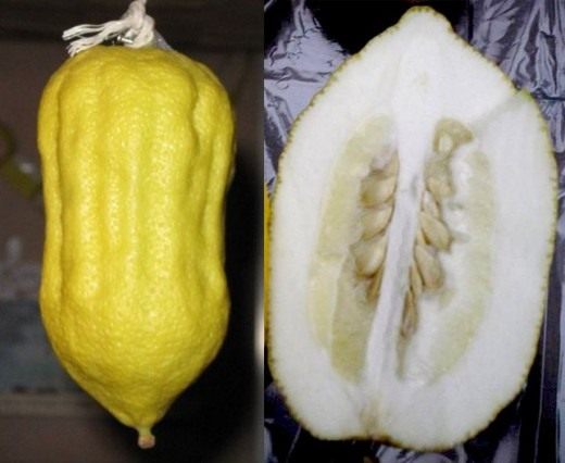 Сацумы (иншиу, Citrus unshiu) тоже условно относят к мандаринам, хотя и выделяют в самостоятельный вид. Это такие особенные японские мандарины, на основе которых тоже выведено множество тангоров (сацума-тангоров, если точно). Но на них мы особенно останавливаться не будем, потому как выглядят они преимущественно как обычные мандарины или мандоры (ну, разве что некоторые с почти красной мякотью), а такого рода картинок в этом обзоре уже предостаточно. Хочется экзотики и сенсаций. Вот, например, вы знаете, что лимон – тоже гибрид? Обыкновенный лимон, который Citrus limon, да. Гибрид, правда, довольно древний. Генетические исследования показали, что всему многообразию нынешних цитрусовых дали начало три вида – самый обычный мандарин, помело и цитрон. Просто, цитрусовые очень легко скрещиваются и не менее легко мутируют. Отсюда и весь карнавал. Собственно по поводу лимона есть две версии: первая – гибрид цитрона и лайма (который в свою очередь мутация цитрона); вторая, более, как мне кажется, правдоподобная, – гибрид апельсина и лайма. Гибридизация случилась очень давно, а вот когда точно и где – неизвестно. Известно только, что когда Марко Поло прибыл к Хубилаю в Китай, лимоны у китайцев уже были. А в 1493 Колумб уже привёз семена лимона на Гаити. Вот. Лимоны все наверняка видели. А вот насчет цитронов я сомневаюсь. А ведь уважаемый фрукт – цитрусовый первопредок, практически. Из всех цитрусовых цитрон – самый изменчивый. Многообразие форм – просто поражает.