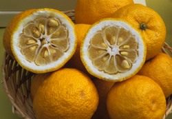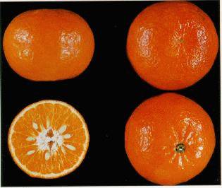 Орландо. Результат опыления грейпфрута «Дункан» пыльцой того же танжерина Дэнси. Получен доктором У. Т. Свинглом в 1911. Для получения коммерчески пригодных плодов танжело Орландо его требуется опылять пыльцой тангора Темпл (Temple, о тангорах позже) или тангеринов Дэнси и Файрчайлд. В качестве подвоя, то есть ствола, на который прививают черенки танжело, используют мандарин Клеопатра или грубый лимон (о грубых лимонах ниже). Вот так вот всё хитро. Сегодняшний потребитель хочет особенно вкусных плодов, то, что само выросло из семечки, есть не станет. Так что, не говорите детям, что фрукты, мол, растут на деревьях. Потому что, если сравнить затраты труда, то, пожалуй, их тут не меньше, чем в изготовлении булочек, которые, как известно, на деревьях не растут. По меньшей мере – сами. А это вот как раз танжело Орландо не сами растут на деревьях: