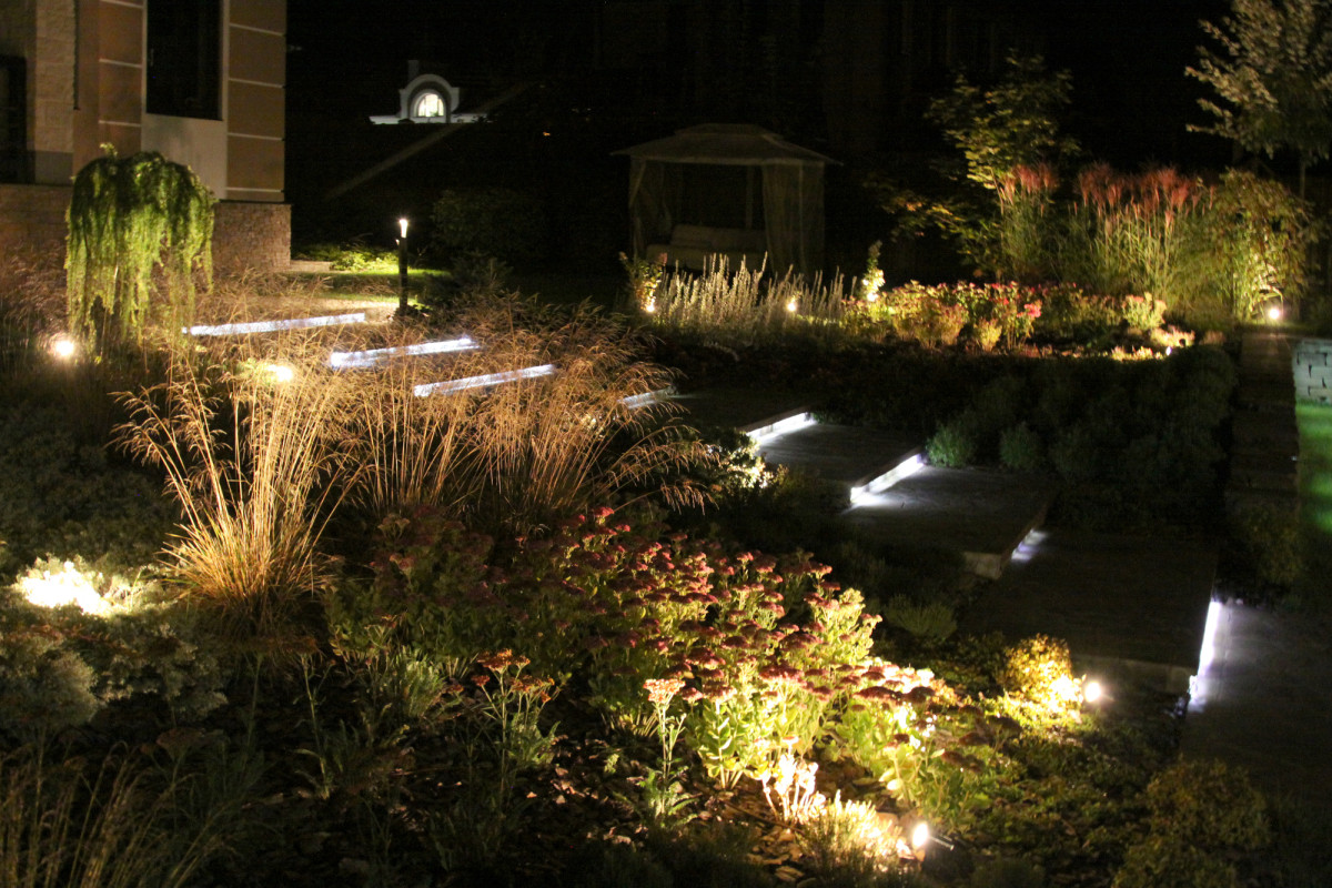 Если на вашем участке имеются поверхности со ступеньками, то хорошей идеей будет их подсветка. Это в первую очередь снизит риск того, что вы где-то запнетесь в темное время суток, а во вторых, добавит стиля участку.