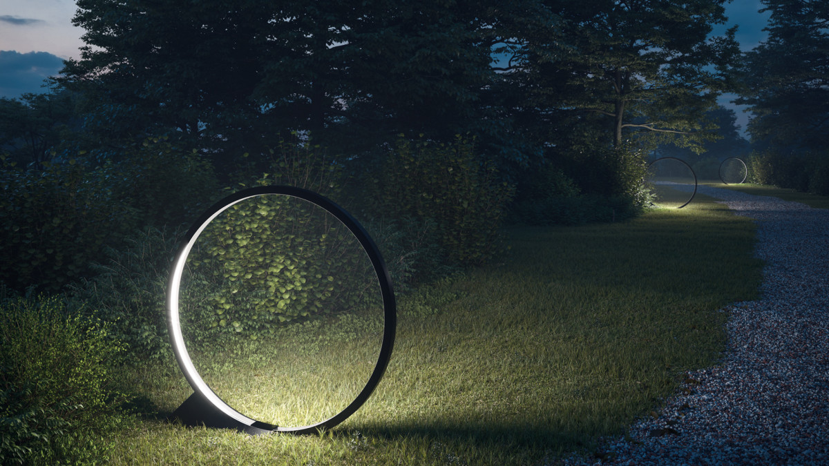 При использовании определенной формы светильников можно получить эффект цветных кругов на земле — выглядит завораживающе.