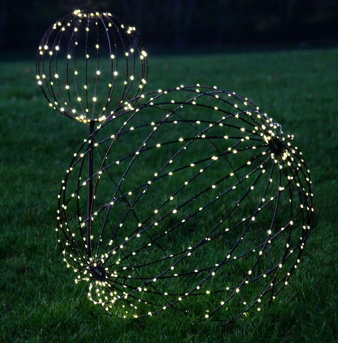 С помощью прутьев и гирлянды можно собрать светящиеся сферы, которые не только подсветят, но и отлично украсят ваш сад. Их можно как подвесить, так и использовать как напольное освещение.