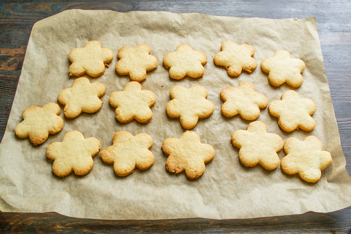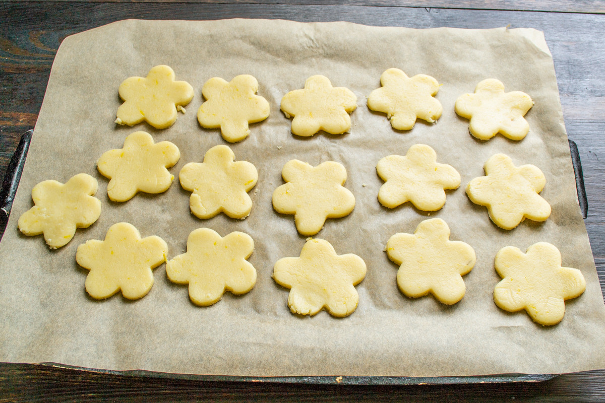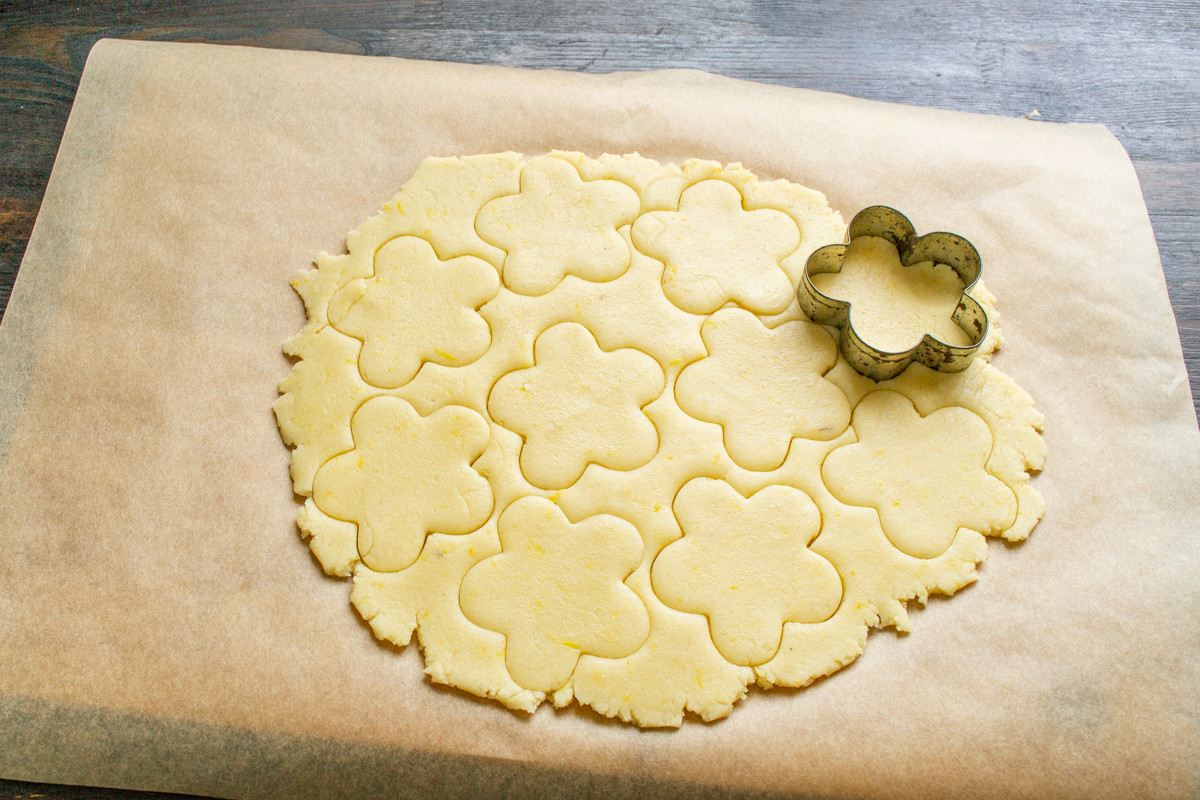 Фигурной формочкой в виде цветка с лепестками вырезаем печенья. Собираем обрезки в ком, снова раскатываем и вырезаем печенья.