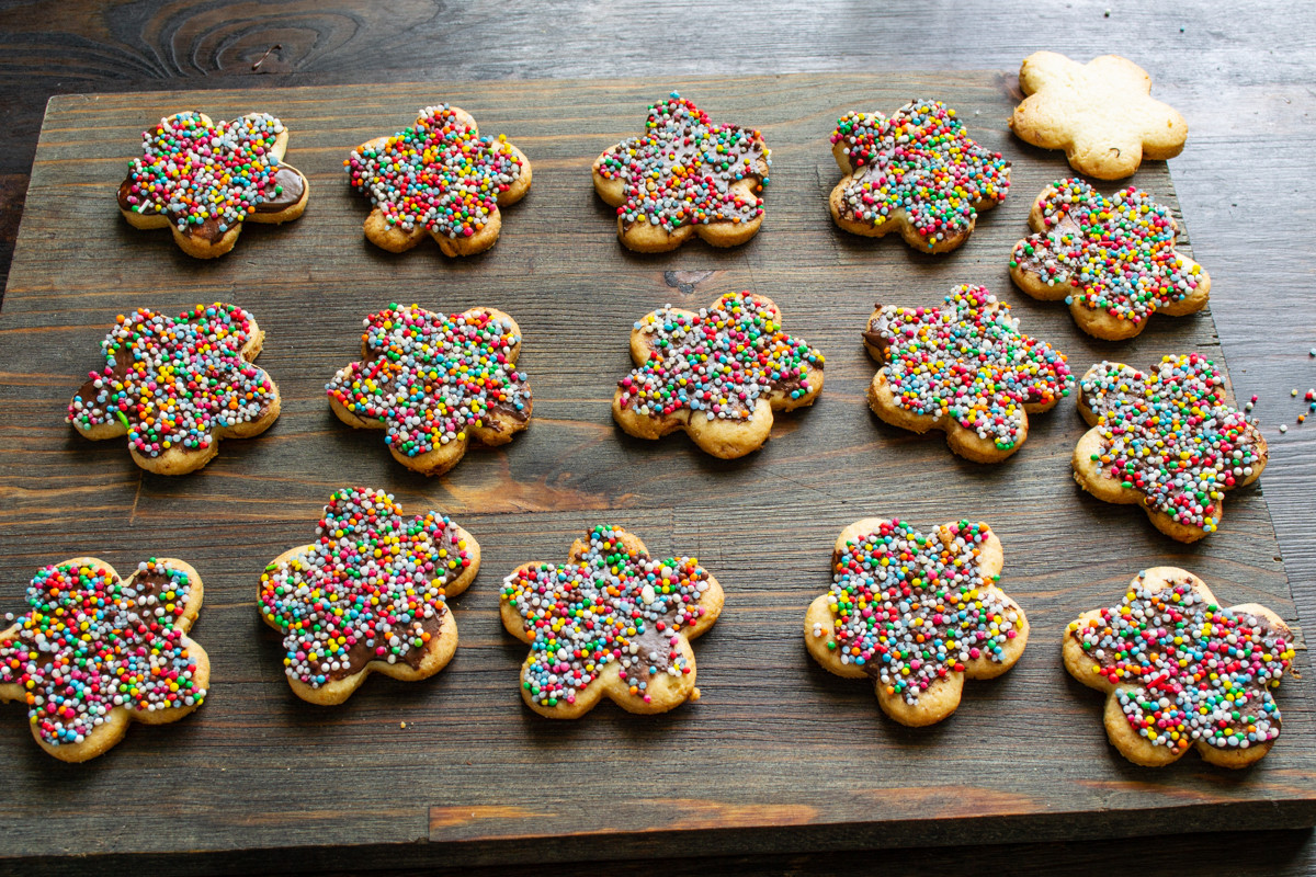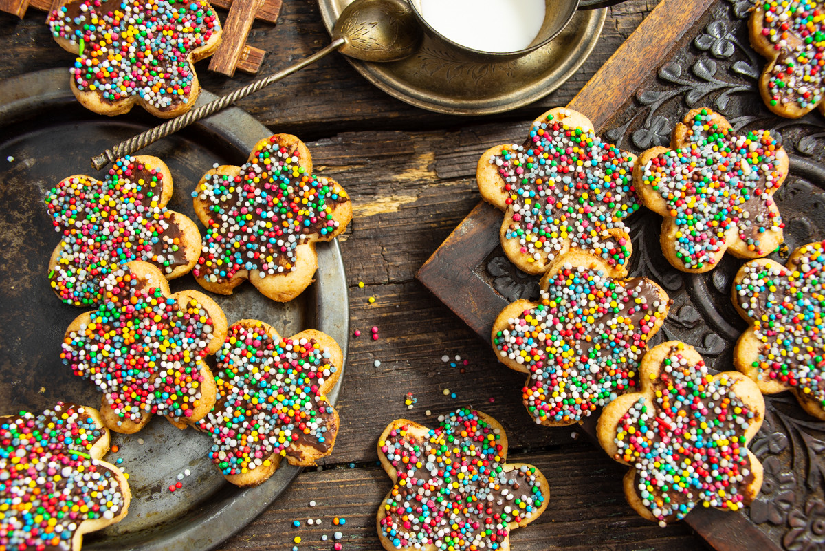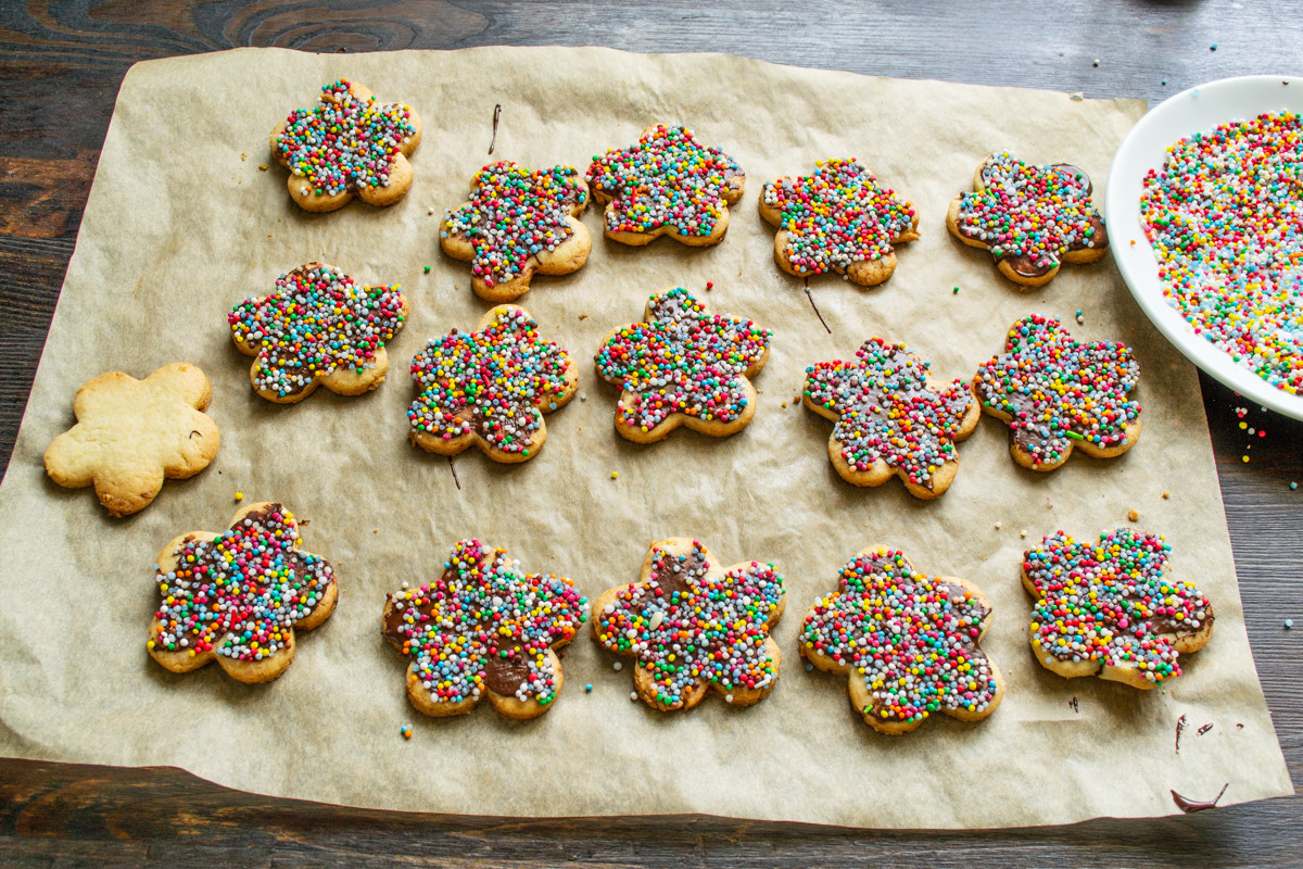 Готовое печенье остужаем на противне. На водяной бане или в микроволновой печи растапливаем плитку шоколада. В тарелку насыпаем кондитерское конфетти. Смазываем печенье растопленным шоколадом, сразу обмакиваем в конфетти и выкладываем на бумагу. Украшенное печенье убираем на время в холодильник, чтобы шоколад застыл.