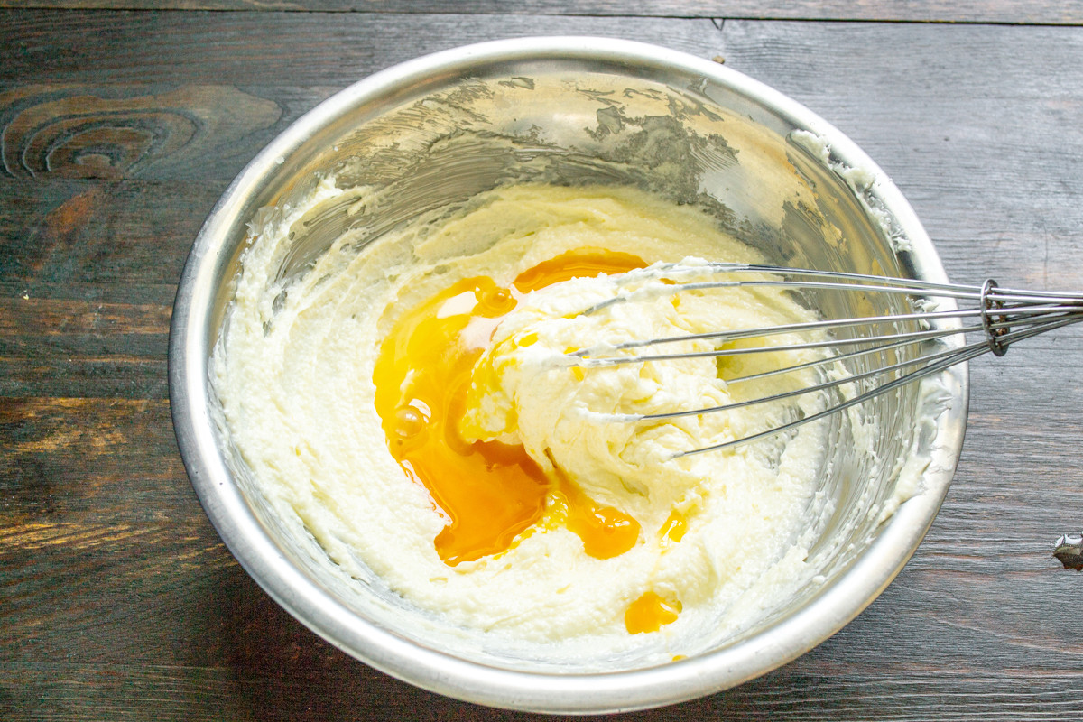 Разбиваем яйца в отдельную миску. Отделяем белок от желтков. Яичные желтки добавляем в тесто, наливаем молоко комнатной температуры, перемешиваем венчиком. Белок можно заморозить и затем использовать в выпечке или кулинарии.