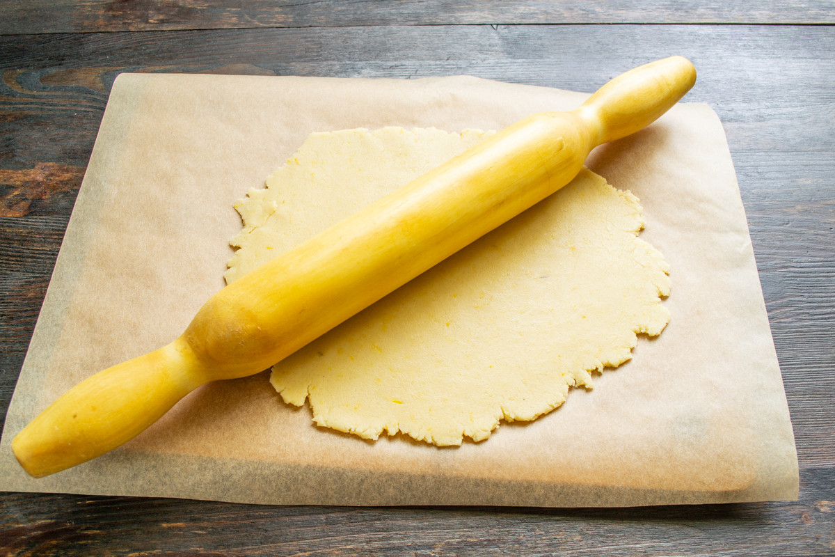 На разделочную доску кладем лист силиконовой бумаги для выпечки. Раскатываем охлажденное тесто в пласт толщиной примерно в половину сантиметра или чуть тоньше. Чтобы тесто не прилипало к скалке, смажьте скалку растительным маслом.