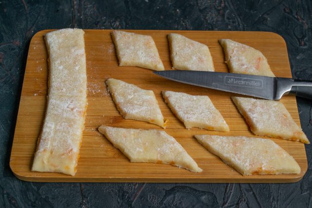 Посыпаем доску сахарной пудрой, выкладываем тесто, раскатываем в прямоугольник толщиной менее половины сантиметра. Нарезаем раскатанное тесто широкими полосами, полосы нарезаем ромбами.