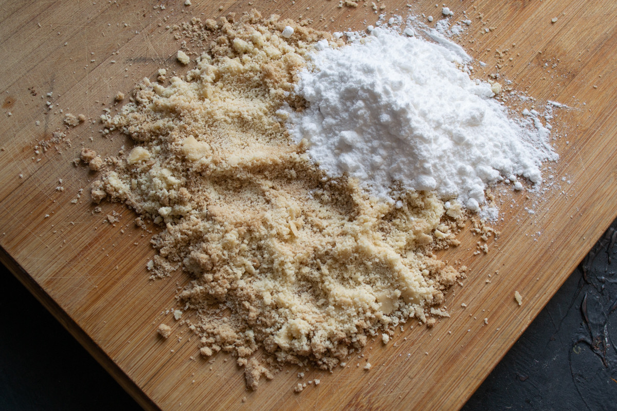 Насыпаем миндальную муку с сахарной пудрой.