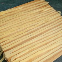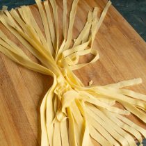 Разворачиваем нарезанные рулетики теста и раскладываем лапшу на доске. Чтобы лапша не склеивалась на этом этапе можно чуть припылить доску мукой.