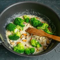 В ту же кастрюлю, в которой варилась брокколи, кладём подсушенную лапшу, отвариваем несколько минут до готовности. Перекладываем лапшу в соус, туда же добавляем несколько столовых ложек воды, в которой варились макаронные изделия и капуста.