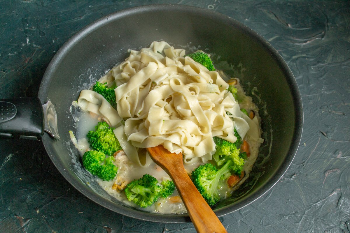 Способ приготовления домашней лапши с соусом из мидий и брокколи