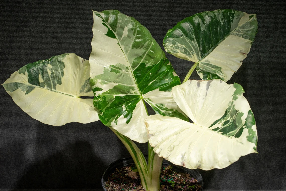 Однако если уж решили раскошелиться, будьте готовы к тому, что за алоказией Макроризой вариегатной (Alocasia macrorrhizos variegata) придется максимально тщательно ухаживать. И надеяться, что со временем листья все же сохранят первоначальную окраску, не уйдя в однотонный белый. Хотя, конечно, ни высокая цена, ни прихотливость растения не сравнятся с его живописностью: крупные лопасти листьев, преисполненные заключенной в глянце эстетики контрастов, просто не позволят оторвать от них глаз.