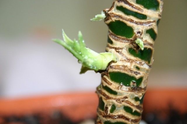 Обрезать надо острым ножом, потому что секатор неизбежно заминает ткани. Контейнер с обрезанным остовом драцены можно поставить в дальний угол до пробуждения спящих почек, только не забывайте его изредка поливать.