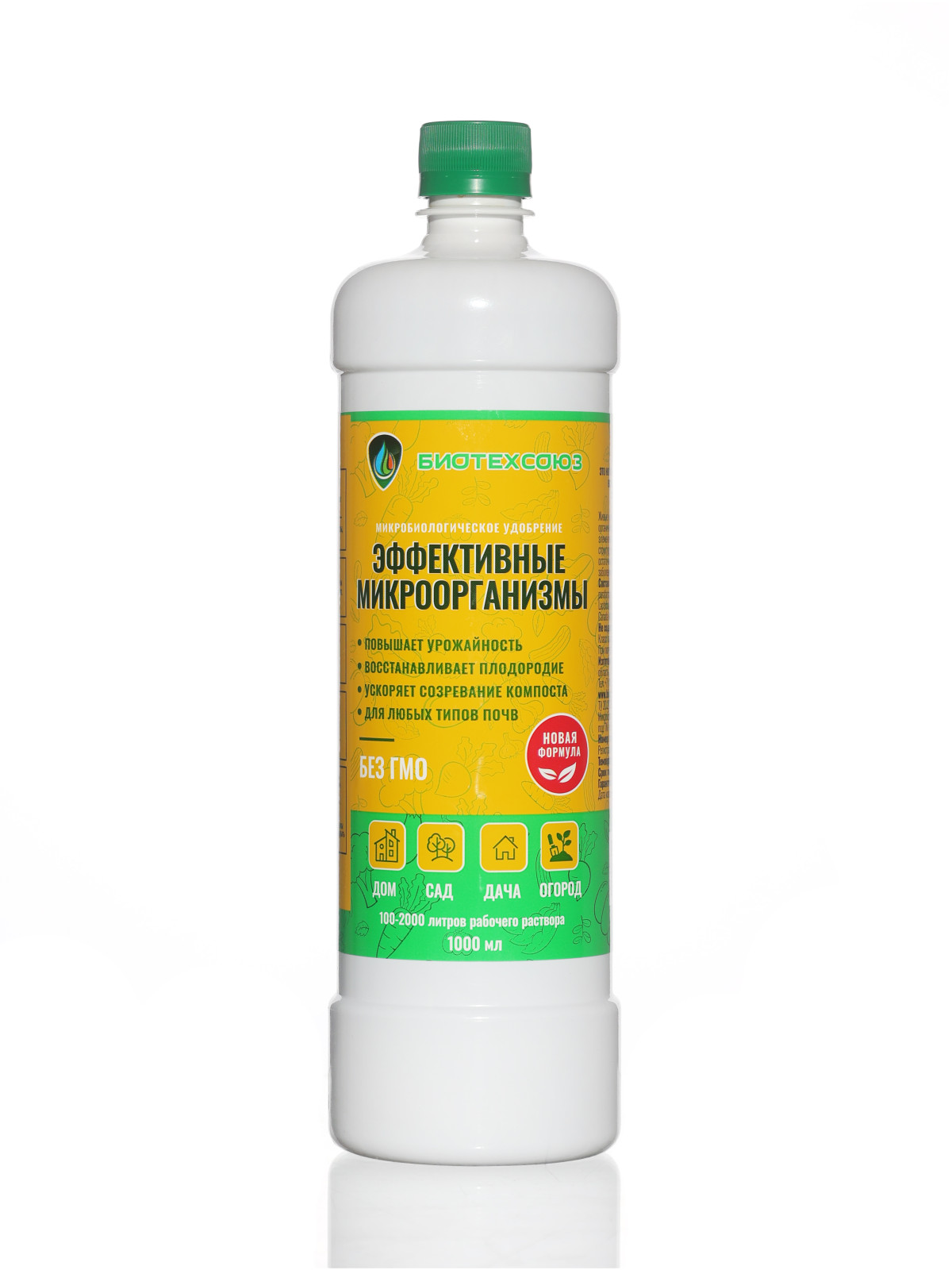 Главная цель удобрения «Эффективные микроорганизмы Биотехсоюз» — повышение плодородия почвы и, как следствие, увеличение урожайности произрастающих на ней культур. В его составе находятся не только молочнокислые и фотосинтезирующие бактерии, но и микроорганизмы, которые позволяют фиксировать азот — жизненно важный элемент для растений. Кроме того, в состав входят сахаромицеты и биологически активные вещества микробиологического синтеза.
