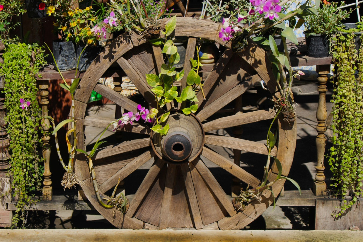 Тележные колеса можно использовать как фигурные держатели для подвесных кашпо. Приспособить в качестве необычных ножек и подлокотников для скамеек и кресел и т.д. Но и в качестве самостоятельного декора они смотрятся очень эффектно.