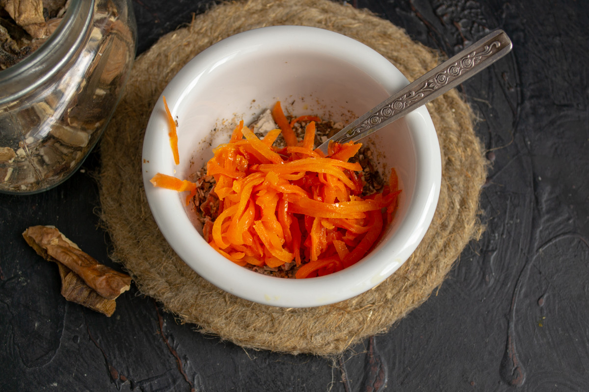 К грибному порошку добавляем обжаренную морковь.