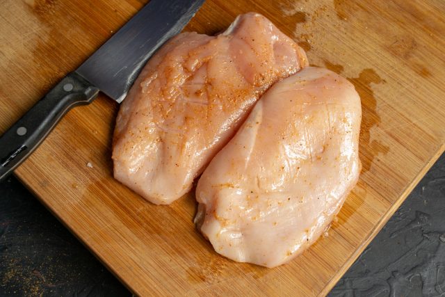 Курицу солим, посыпаем молотой сладкой паприкой, втираем специи снаружи и изнутри, затем поливаем оливковым маслом. С двух сторон можно легонько надрезать филе острым ножом крест-накрест. Резать нужно аккуратно, чтобы не прорезать кармашки насквозь – начинка вытечет на противень.