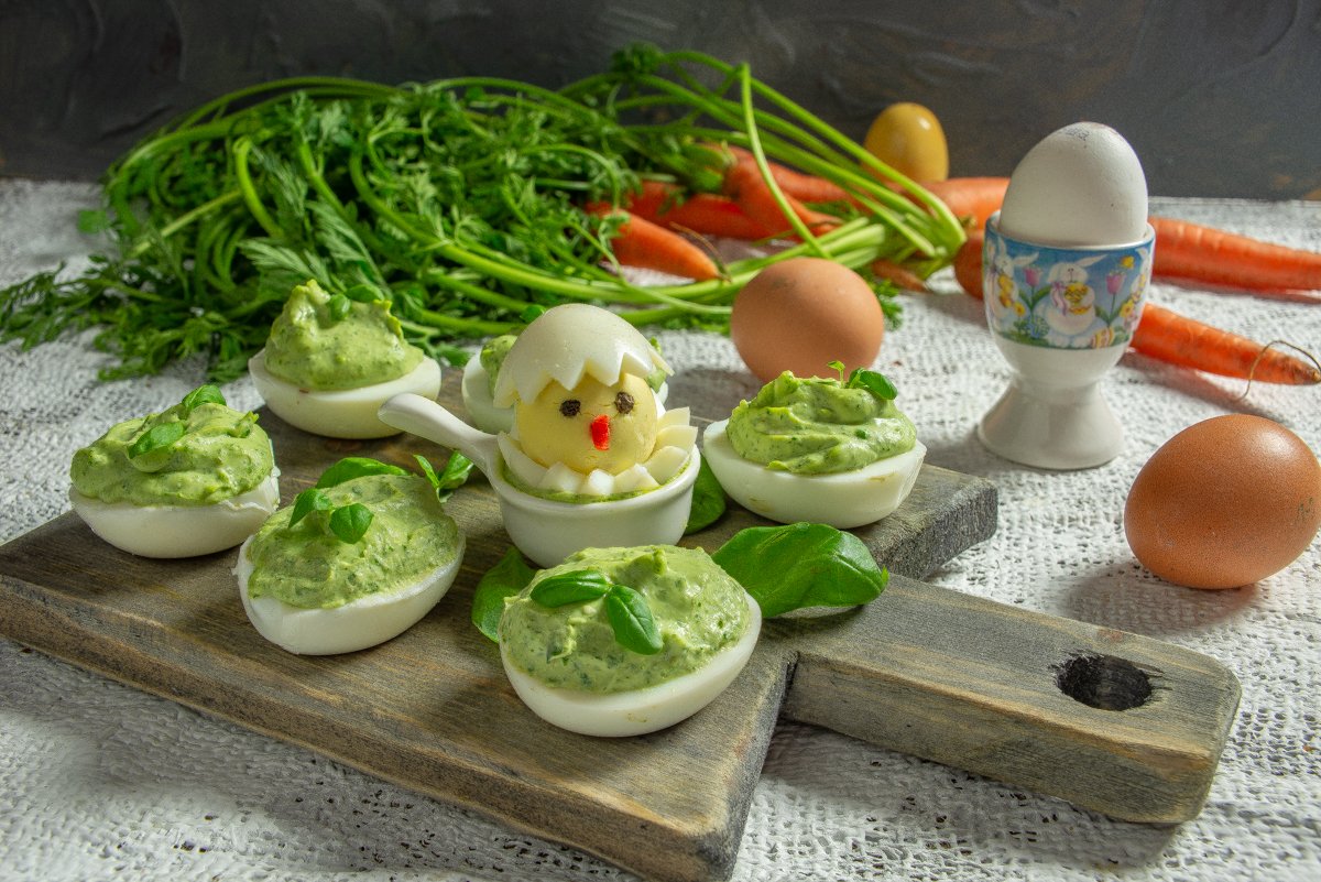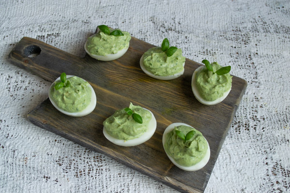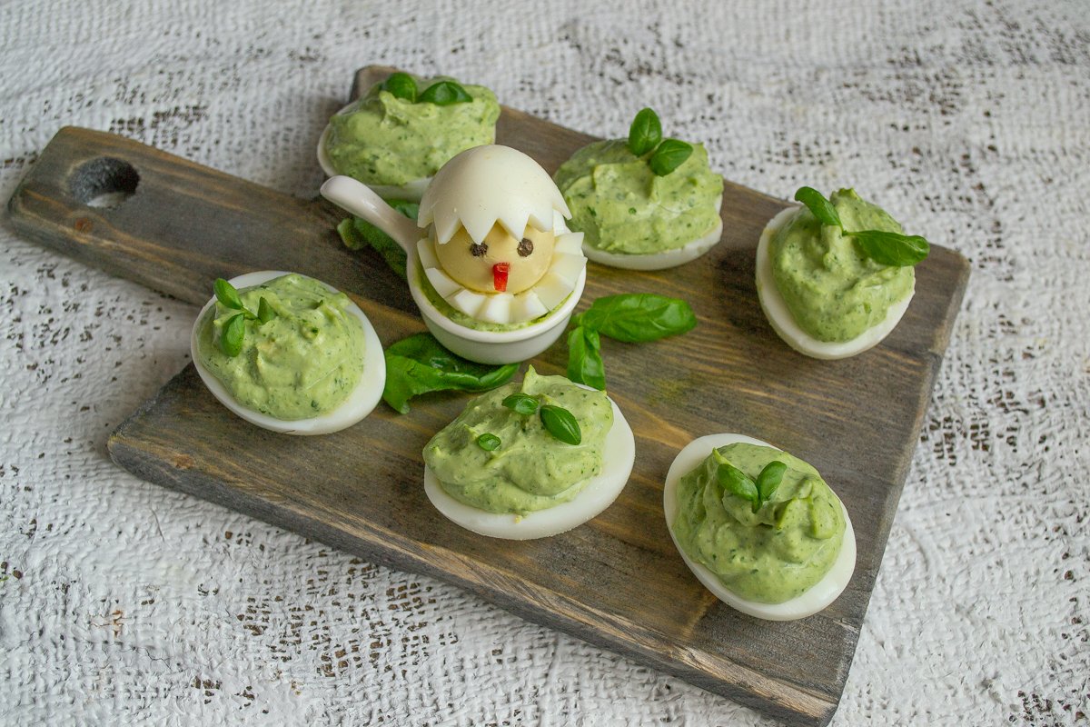 Фаршированные яйца — классическая холодная закуска. Ищете красивые и простые идеи для пасхального стола? Приготовьте яйца, фаршированные кремом из сливочного творожного сыра, ароматного зелёного базилика и вкусного оливкового масла. Базилик, как и любая другая съедобная зелень, окрашивает крем в нежный салатовый цвет, получается по-весеннему радостно, красиво, аппетитно и очень вкусно. Такие лёгкие закуски отличное начало праздничного застолья! Можно разнообразить ассортимент — приготовьте половину фаршированных яиц с базиликом, а в другую половину вместо базилика добавьте свежую кинзу. Кстати, с укропом тоже получается вкусно!