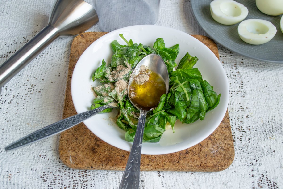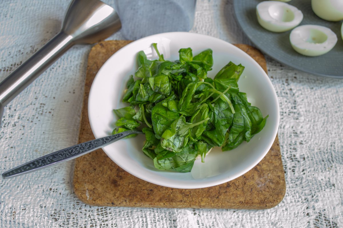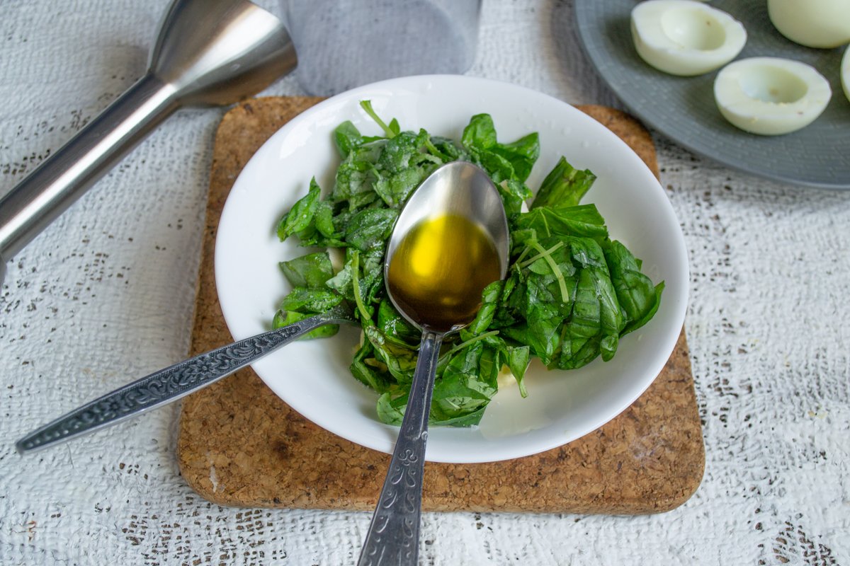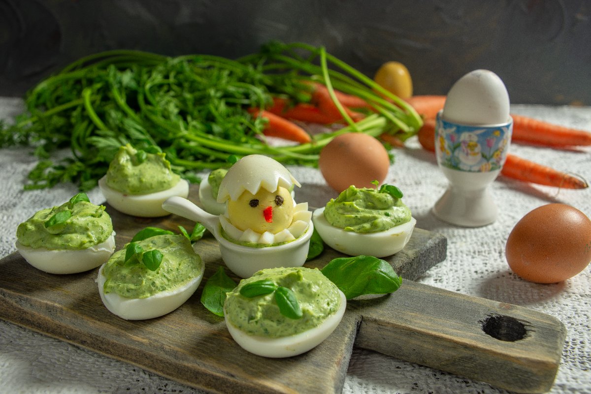 Фаршированные яйца — классическая холодная закуска. Ищете красивые и простые идеи для пасхального стола? Приготовьте яйца, фаршированные кремом из сливочного творожного сыра, ароматного зелёного базилика и вкусного оливкового масла. Базилик, как и любая другая съедобная зелень, окрашивает крем в нежный салатовый цвет, получается по-весеннему радостно, красиво, аппетитно и очень вкусно. Такие лёгкие закуски отличное начало праздничного застолья! Можно разнообразить ассортимент — приготовьте половину фаршированных яиц с базиликом, а в другую половину вместо базилика добавьте свежую кинзу. Кстати, с укропом тоже получается вкусно!