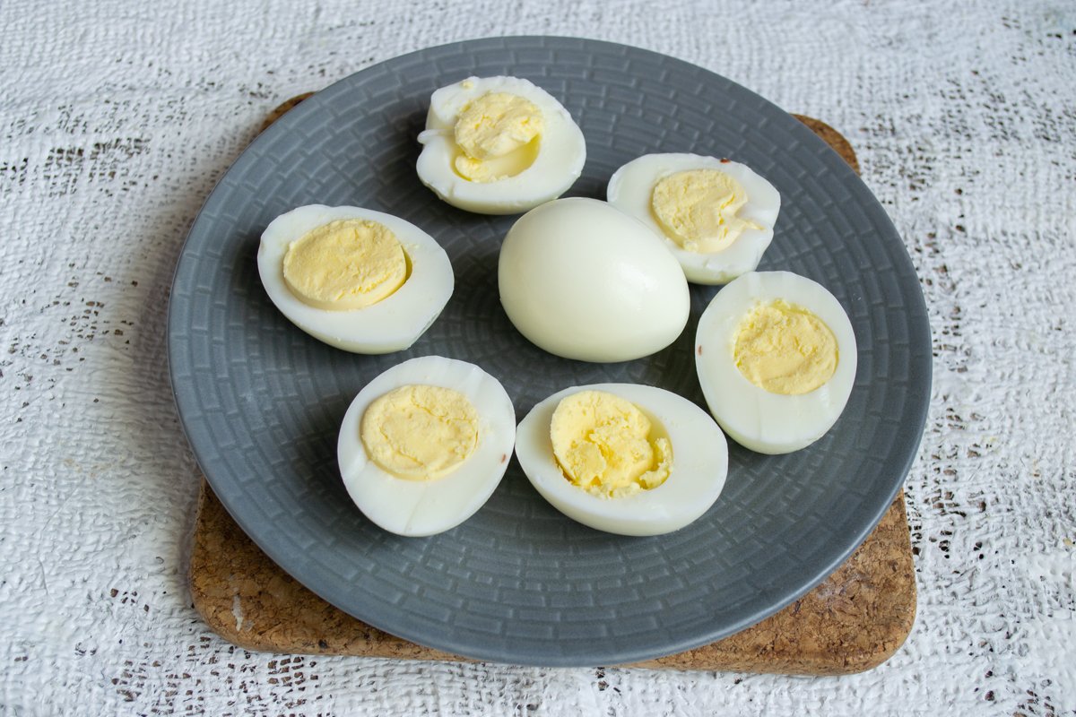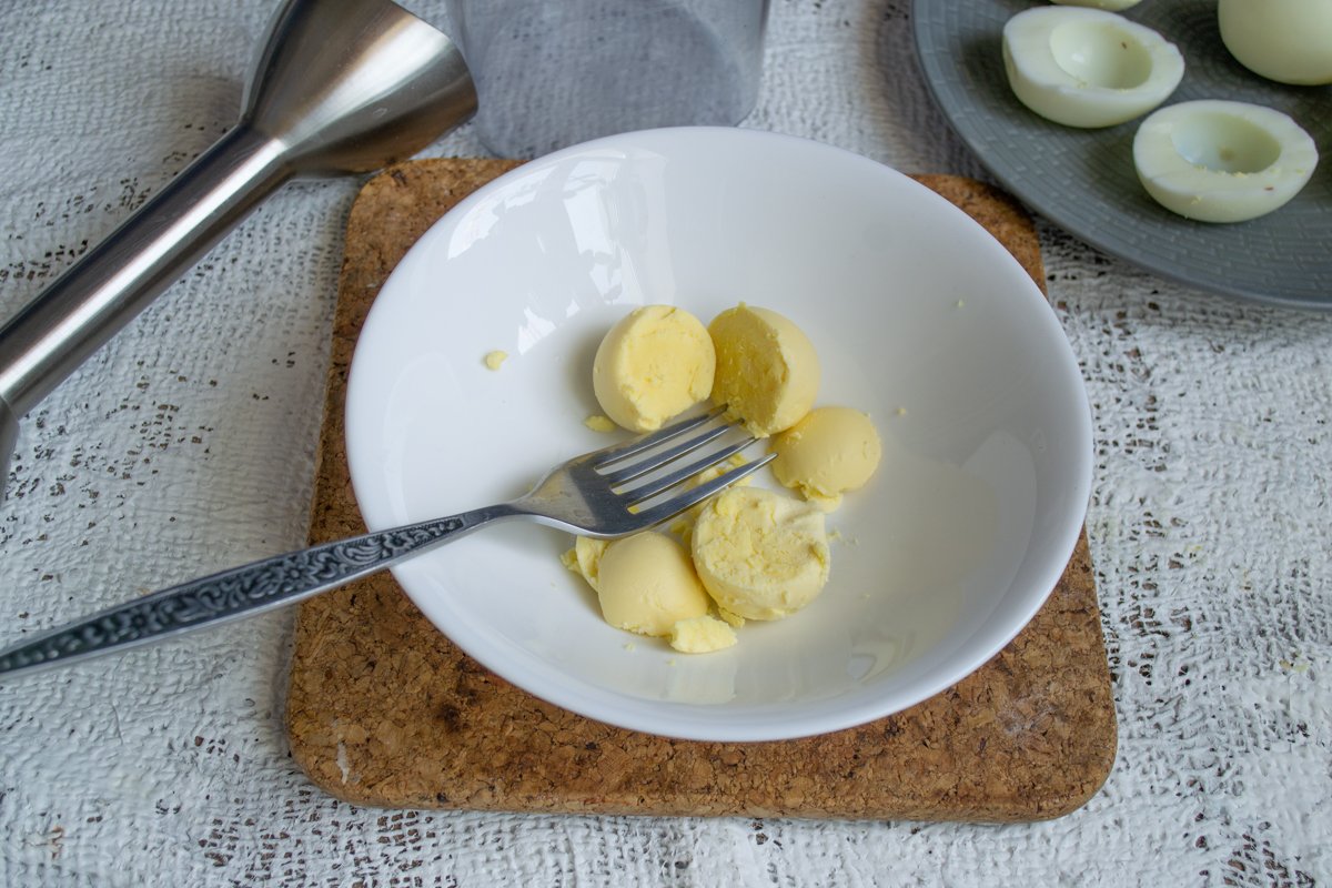 Отвариваем вкрутую четыре куриных яйца, охлаждаем в холодной воде. Три яйца разрезаем вдоль пополам, одно оставляем для украшения. Достаём яичные желтки из половинок яиц.
