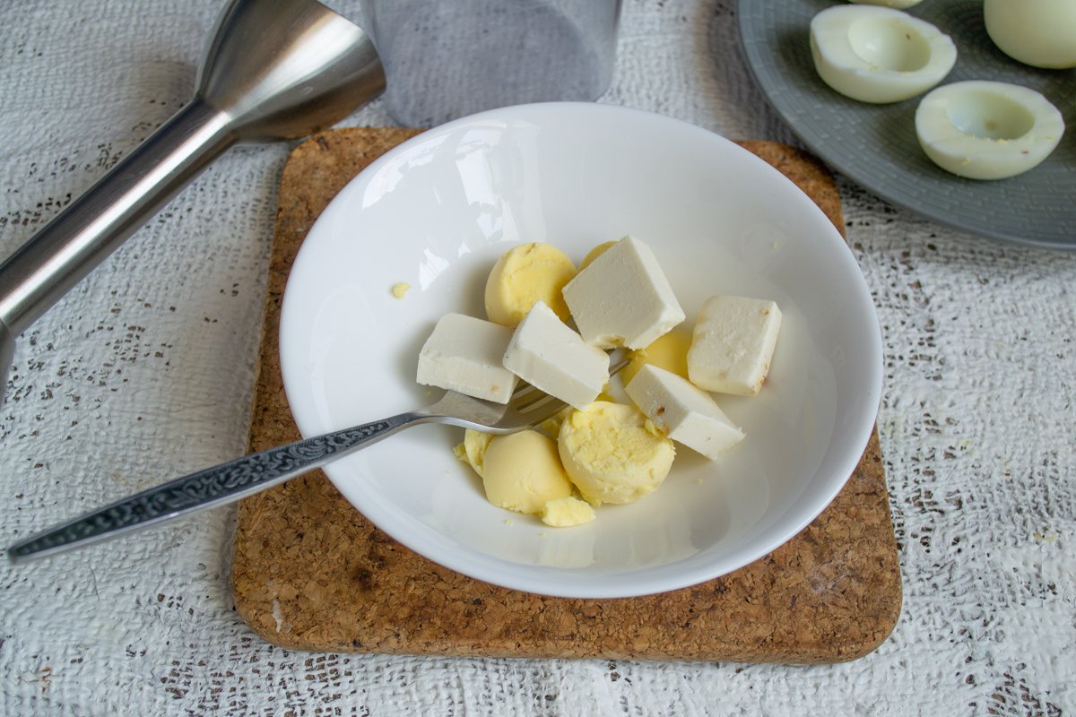 Добавляем любой сливочный творожный сыр. Для этого рецепта фаршированных яиц подойдет «Филадельфия», даже с фетой или брынзой получается вкусно, важно чтобы консистенция сыра была нежной, без творожистых крупинок.
