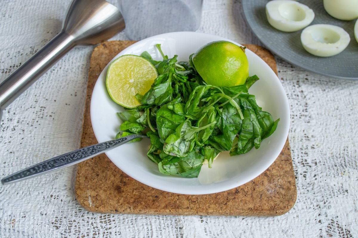 Выжимаем 2-3 чайные ложки сока лайма, натираем на мелкой тёрке цедру половинки лайма. В этом рецепте фаршированных яиц лайм можно заменить лимоном, тоже будет вкусно.