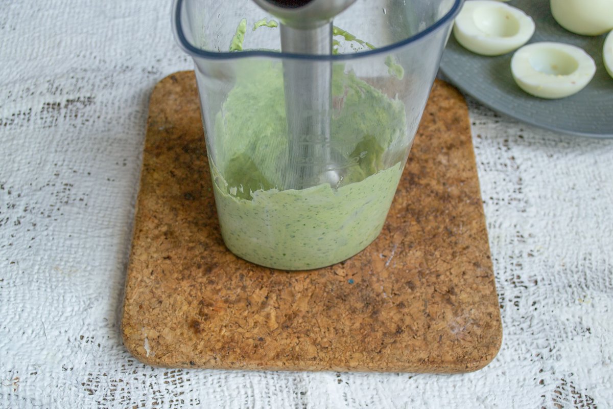 Наполняем половинки яиц салатовым кремом. Можно переложить крем в пакет с кондитерской насадкой и отсадить в половинки яиц кремовые розочки.